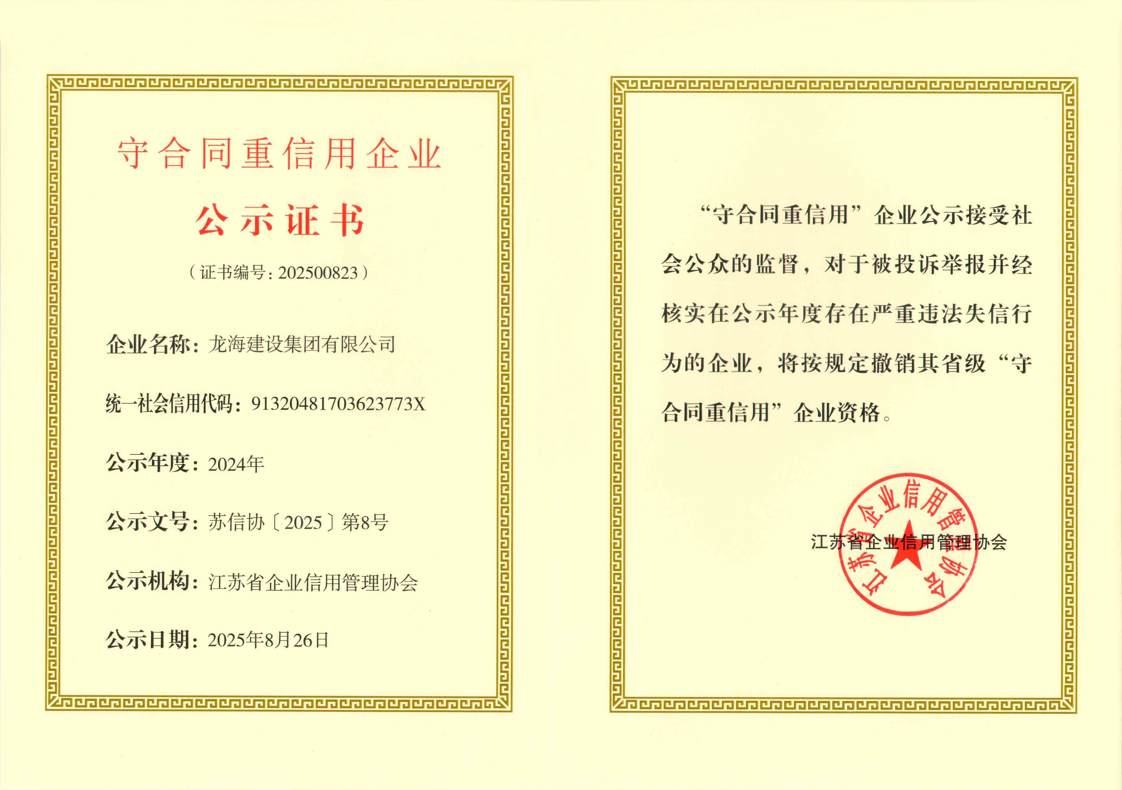 近日,從江蘇省企業(yè)信用管理協(xié)會傳來喜訊,龍海建設(shè)集團有限公司憑借在合同管理和信用建設(shè)方面的卓越表現(xiàn),成功獲得 “2024年度江蘇省守合同重信用企業(yè)”榮譽稱號。這一榮譽不僅是對龍海建設(shè)集團過往努力的高度認可,更是其在建筑行業(yè)持續(xù)穩(wěn)健發(fā)展的有力見證。
